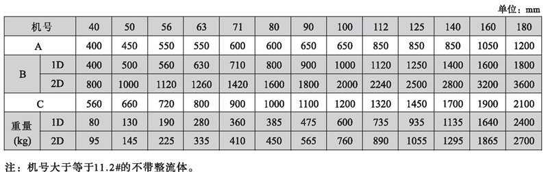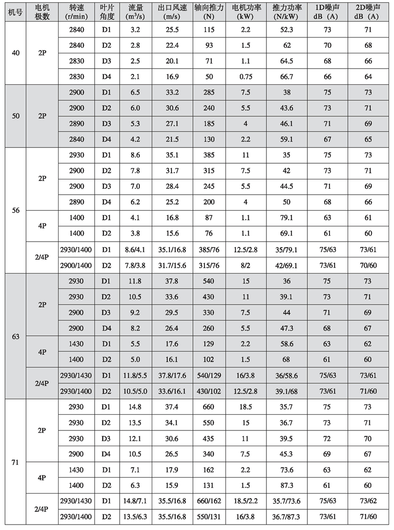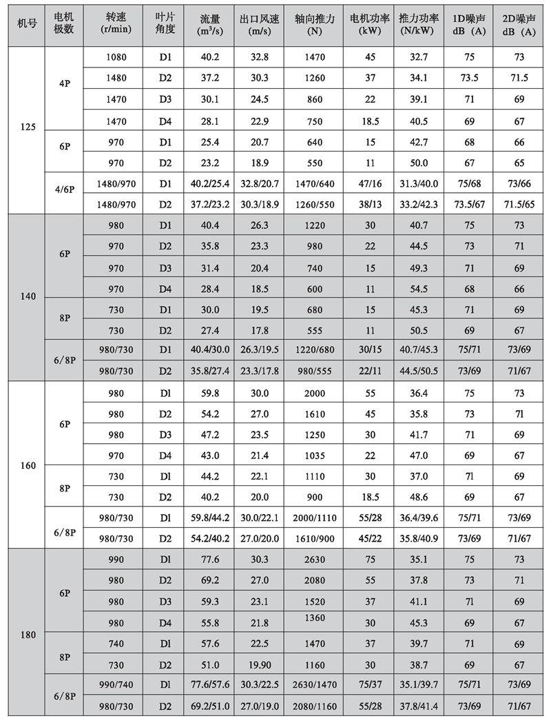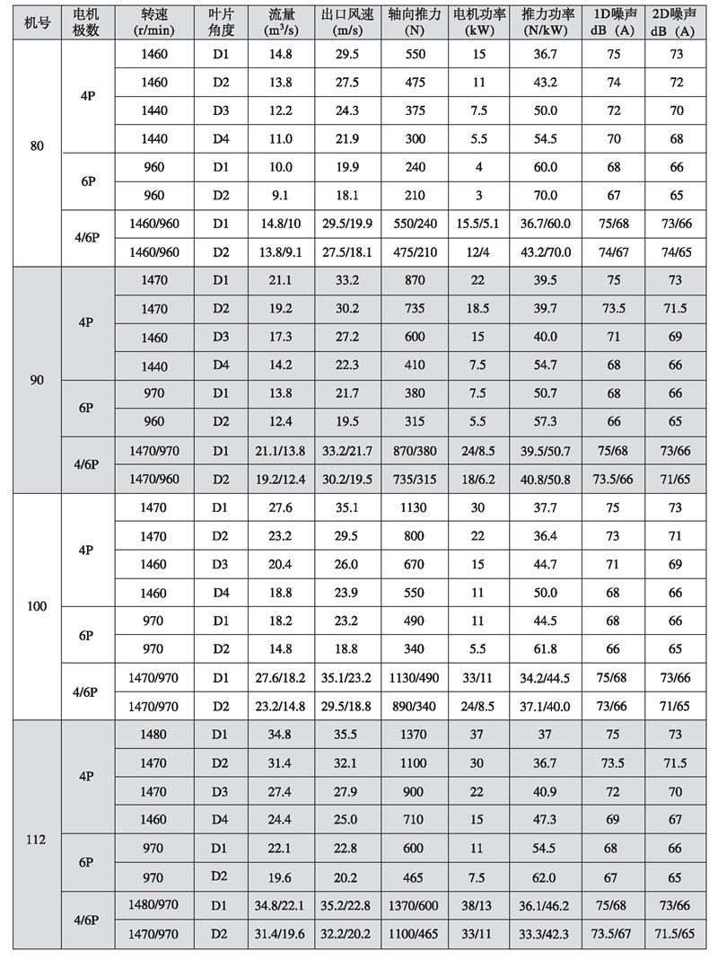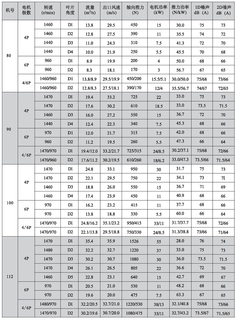 5)性能参数表中所列噪声值为在野外、距风机出口10米、45度角处测量的A声级